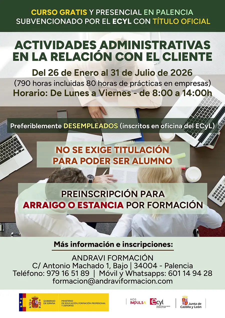 Curso Presencial y gratuito a realizar en Palencia. Subvencionado por el ECYL, con título OFICIAL, orientación laboral y prácticas en empresas. El curso es en horario de mañanas de Lunes a Viernes, de 15:00 a 21:00 horas.